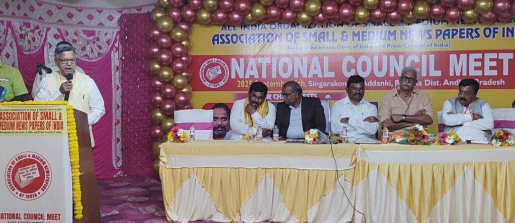 आंध्र प्रदेश। अड्डांकी जिला ओंगूले, आंध्र प्रदेश में एसोसिएशन ऑफ स्मॉल एंड मीडियम न्यूजपेपर्स आफ इंडिया के राष्ट्रीय परिषद की बैठक उल्लासपूर्ण वातावरण में सम्पन्न हुई जिसमें पूर्व केंद्रीय मंत्री श्रीदुगबत्ती वैंकेटेश्वरा राव पूर्व मंत्री गोटापतिरवि कुमार पद्मश्री येदलापल्ली वैंकटेश्ररा राव के साथ राज्य के मुख्य सूचना आयुक्त के साथ ही सभी एन सी मेम्बरों आदि ने  में भाग लेकर उपस्थित सदस्यों को संबोधित किया। उद्घाटन से पूर्व स्थानीय कलाकार बच्चियों ने भरतनाट्यम की शानदार प्रस्तुतियां दी।