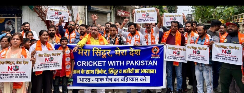 देहरादून । शिवसेना उत्तराखंड ईकाई द्वारा शिव सेना राष्ट्रीय नेतत्व के आह्वान पर भारत पाक क्रिकेट मैच के बहिष्कार की मांग को लेकर शिव सेना मुख्यालय पर रोष प्रकट किया। प्रधानमंत्री को ऑपरेशन सिंदूर याद दिलाने के लिए प्रदर्शन के बाद शिव सैनिकों ने घर घर से सिंदूर एकत्रित कर प्रधान मंत्री कार्यालय भेजा। इस अवसर पर शिव सेना राज्य प्रमुख गौरव कुमार ने कहा कि 22 अप्रैल 2025 को पहलगाम ने नरसंहार हुया जिसमे 27 लोगो की जान गई, उस समय केंद्र सरकार द्वारा ऑपरेशन सिंदूर चलाया गया, जिसमे पाकिस्तान से सभी रिश्ते ख़त्म करने की बात की गई, परंतु आज वही केंद्र सरकार उसी आतंकवाद को पालने वाले पाकिस्तान के साथ क्रिकेट मैच खेल रही है। गौरव कुमार ने कहा कि भारत पाक मैच उन 26 परिवारों एंव ऑपरेशन सिंदूर में शहीद हुए देश के जवानों का अपमान होगा। केंद्र सरकार को 140 करोड़ देशवासियो की भावनाओ की क़दर करनी चाहिए। प्रदेश उपप्रमुख पंकज तायल ने कहा कि 22 अप्रैल को पहलगाम में हुई आतंकी हमले के बाद यह मैच खेलना उचित नहीं है। पूरी दुनिया जानती है की पाकिस्तान आतंकवादी गतिविधियों का संचालन करता है, ऐसे में पाक के साथ क्रिकेट मैच खेलना निंदनीय है, प्रधान मंत्री को इसे रोकना चाहिए। जिला प्रमुख अमित कर्णवाल ने कहा कि 26 महिलायो ने अपना सुहाग को खोया है, पाक के साथ खेलने में उनकी आत्मा को गहरी ठेस लगेगी। प्रधानमंत्री को पाकिस्तान के ख़लिफ़ खेलने के बजाय 26 शोकाकुल परिवारों के समर्थन में मैच रद्द करना चाहिए। इस अवसर पर जिला उपप्रमुख शिवम गोयल, जितेंद्र निर्वाल , वासु गौरव कुमार, विकास मल्होत्रा, रोहित बेदी, मनोज सरीन, अमित बजाज, किशन गोपाल, मनमोहन साहनी, राज नेगी, फरीद अली, अमित डिमरी, गौरव कलानी, गोकुल परविंदा, इक्विन्द्र सिंह, अक्षय महंद्रू, जयंत चड्ढा, सुमित गंभीर, अक्षय शर्मा , कविता आहूजा, दीपाली बेदी, निधि बजाज ,आकाश अग्रवाल, रवि ग्रोवर, उमेश सिंह, रजनीश गर्ग, विजय गुलाटी, मनिंदर सिंह, देव सिंह, कृष्णा बेदी, रवि गुप्ता, लक्ष्य बजाज, विकास सिंह, रोहित गर्ग, देव बेदी आदि मौजूद रहे।