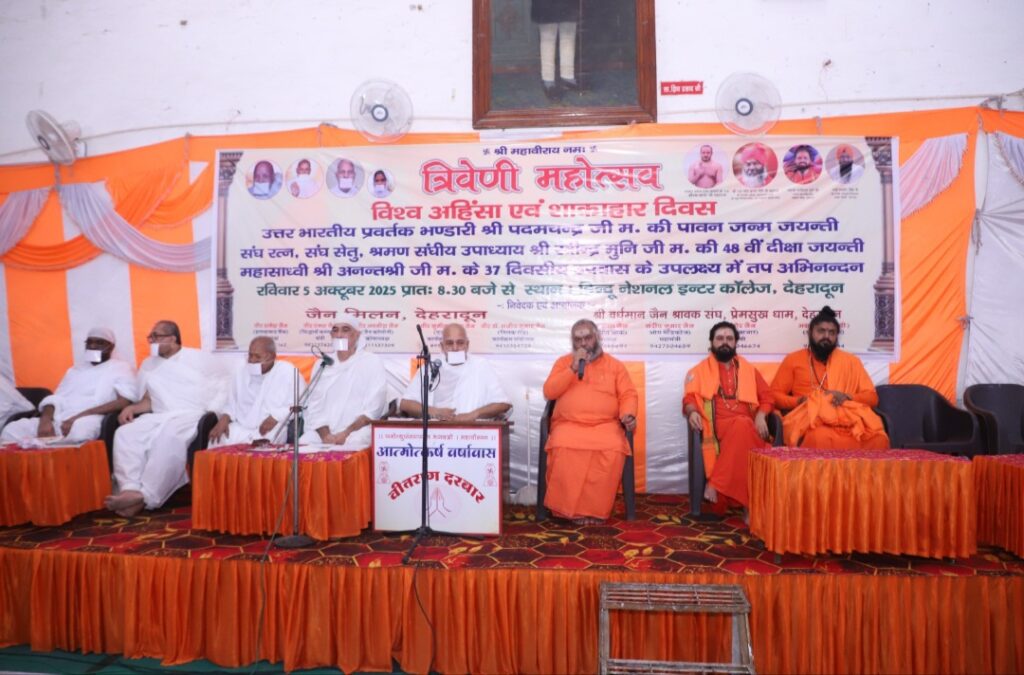 देहरादून । हिंदू नेशनल इंटर कॉलेज देहरादून में जैन मिलन देहरादून एवं श्री वर्धमान जैन श्रावक संघ के तत्वावधान में त्रिवेणी महोत्सव का आयोजन किया गया। अंतर्राष्ट्रीय अहिंसा दिवस के इस अवसर पर अहिंसा दिवस कार्यक्रम के साथ उपाध्याय रविंद्र मुनि जी महाराज का 48 वा दीक्षा दिवस, आचार्य पदम चंद्र जी महाराज की जन्म जयंती तथा महासाध्वी अनंत श्री जी महाराज की 37 दिवसीय उपवास तपस्या को बहुत हर्षोल्लास के साथ बनाया गया कार्यक्रम में मुख्य अतिथि तुलाज ग्रुप के अध्यक्ष सुनील कुमार जैन रहे तथा सभाअध्यक्ष लोकेश जैन थे। ध्वजारोहण शकुंतला जैन द्वारा किया गया। कार्यक्रम का शुभारंभ पूज्य उपाध्याय रविंद्र मुनि जी महाराज द्वारा मंगलाचरण कर किया गया। कार्यक्रम में ज्योतिष दिवाकर श्री राजेश मुनि जी महाराज सहित रिधिमा जी महाराज, टपकेश्वर महादेव मंदिर के महंत श्री कृष्णागिरी जी महाराज, अभय मठ के स्वामी परविंदर पुरी जी, सिंह सभा गुरुद्वारा के मुख्य ग्रंथी भाई शमशेर सिंह जी सहित अनेको साधु सदियों ने सभी को अपने आशीर्वाद एवं प्रवचनों का लाभ दिया।