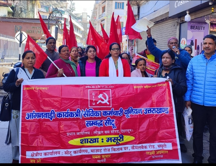 शिक्षा व स्वास्थ्य के क्षेत्र में कार्य कर रही आशाएं आंगनवाड़ी व भोजन माताओं का मानदेय नहीं बढा रही। मजदूरों के हड़ताल के हक को छीना जा रहा है। अमेरिका से डील कर देश के किसानों को आत्महत्या के लिए मजबूर किया जा रहा है। ऐसे में मजदूरों को एक होकर संघर्ष करना पडे़गा व सरकारी की नीति का विरोध किया जायेगा। इस मौके पर सीटू के सोबन सिंह पंवार ने कहाकि देश व्यापी हड़ताल के तहत मसूरी में भी विरोध प्रदर्शन किया गया व नौ सूत्रीय ज्ञापन राष्ट्रपति को प्रेषित किया गया। जिसमें केंद्र सरकार श्रम सहिंता को समाप्त करे होटल स्कूल दुकानों में कार्यरत कर्मचारियों को 26 हजार न्यूनतम वेतन घोषित करे भविष्य निधि बोर्ड में श्रमिक संगठनों को प्रतिनिधित्व दिया जाय केंद्र सरकार एवं राज्य सरकार के सार्वजनिक प्रतिष्ठान बैंक बीमा रक्षा पोस्टल, रेलवे सहित अन्य औद्योगिक क्षेत्रों के निजीकरण पर रोक लगायी जाय केंद्र एवं राज्य सरकार के अंशदान में कार्यरत स्कीम महिला कामगारों आंगनवाड़ी आशा वर्करों भोजन माताओं को राज्य कर्मचारी घोषित किया जाय व न्यूनतम वेतन 26 हजार किया जाय सेवानिवृत्ति के समय सामाजिक सुरक्षा में ग्रेजुएटि पेशन का लाभ दिया जाय, निजी स्कूलों में कार्यरत अध्यापकों कर्मचारियों का आर्थिक शोषण बंद किया जाय व सरकारी मानकों के अनुसार वेतन दिया जाय केंद्र व राज्य सरकार विभिन्न विभागों में रिक्तपदों को भरनेकी कार्रवाई करे व युवाओं को रोजगार दिया जाय बढती मंहगाई पर रोक लगाई जाय मजदूर संध के 107 रिक्शा श्रमिकों को ईरिक्शा व गोल्फकार्ट दी जाय प्रदर्शन में शामिल संगठनों में होटल रेस्टोरेंट कर्मचारी संघ के अध्यक्ष गंभीर सिंह पंवार विक्रम बलुडी आंगनवाडी सहायिका कार्यकर्ती यूनियन की अध्यक्ष जय श्री बिष्ट सचिव ममता राव आशा स्वास्थ्य यूनियन अध्यक्ष बीना रावत व सचिव सुनीता सेमवाल भेजनमाता कामगार यूनियन की अध्यक्षदीपा देवी सविच दर्शनी भटट मजदूर संघ अध्यक्ष संपत लाल व सचिव सोबन पंवार स्कूल कालेज दुकान कर्मचारी यूनियन के अध्यक्ष जगत लाल व सचिव विनोद लाल इद्रश नौटियाल नीरज कुमार संगीता भंडारी मिजान शाह चंद्रपाल रावत उषा प्रीति उत्तम नेगी जगल लाल मुकेश लाल संदीप सहित बड़ी संख्या में कार्यकर्ता मौजूद रहे।
