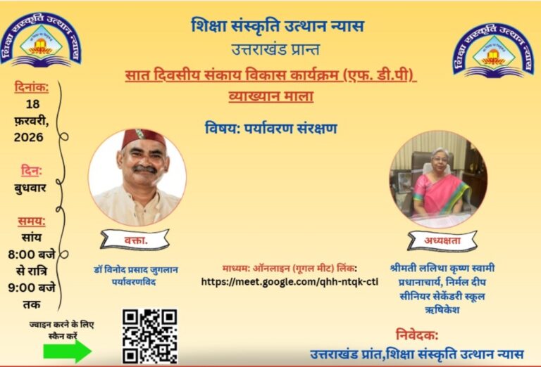 देहरादून। शिक्षा संस्कृति उत्थान न्यास उत्तराखंड द्वारा विभिन्न विषयों पर आधारित विषय विशेषज्ञों की अध्यक्षता में सात दिवसीय आभासीय व्याख्यानमाला...